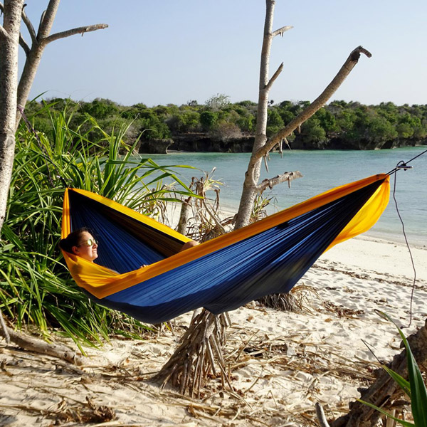 – Pakiranje: izuzetno mala tekstilna vrećica usklađena s bojom ležaljke (torba za višekratnu upotrebu, ušivena na viseću ležaljku)
