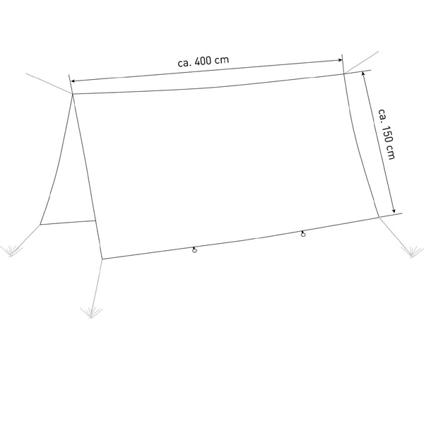 Traveler Tarp XXL ovješena je za pričvrsne točke viseće mreže i zategnuta (uz klinove i užad priloženi su karabinjeri za podešavanje).