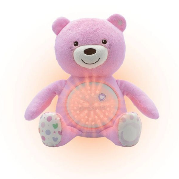 Moj prvi medvjedić – maženje uz opuštajuće zvukove i  nježnju svjetlost. Nježan medvjedić je primjeren za djecu od rođenja, očarat će vas sa svjetlosnim efektima i s opuštajućim melodijama. Dijete će tijekom spavanja uživati u svjetlosnim efektima i opuštajućim melodijama. Medvjedić iz trbuha reproducira svijetlost,a boje se mijenjaju automatski.