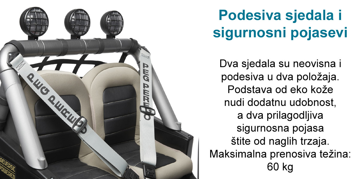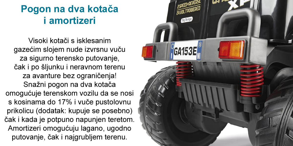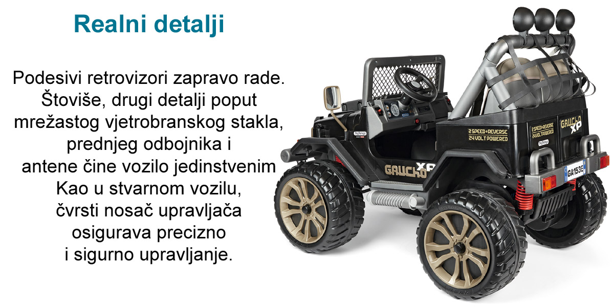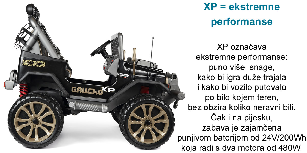 Dugotrajan i opremljen s dva motora od 480 W, djeca starija od 3 godine i više, zajamčeno će uživati u beskrajnoj zabavi. Pravi talijanski dragulj, Gaucho XP radi s punjivom baterijom od 24V / 8Ah / 200Wh.