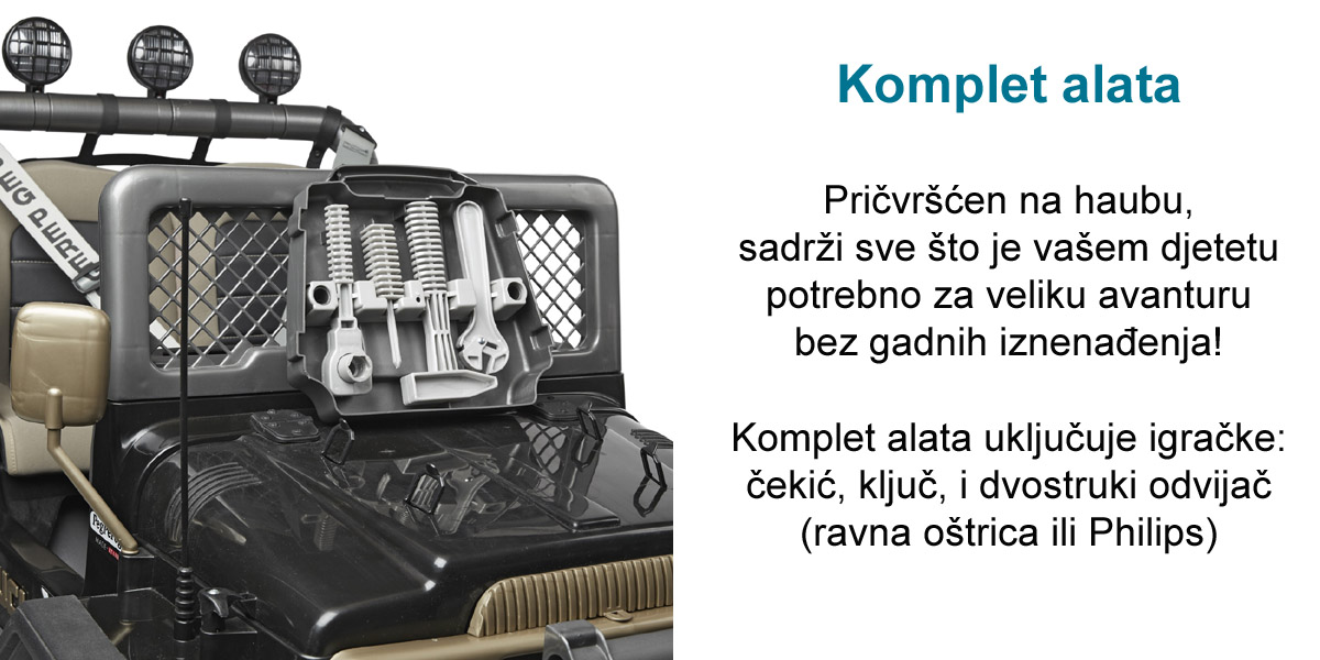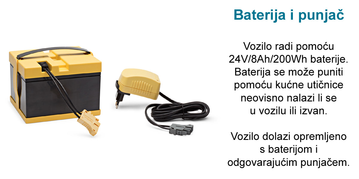 U kompletu: quad na akumulator, baterija od 24V 8Ah i punjač. Maksimalna nosivost: 60 kg